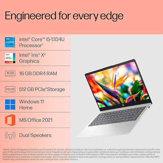 HP 14, 13th Gen Intel Core i5-1334U Laptop (16GB DDR4,512GB SSD) Anti-Glare, Micro-Edge, 14/35.6cm, FHD, Win11, M365 Basic(1yr),Office Home24, Silver,1.4kg, FHD Camera w/Privacy Shutter