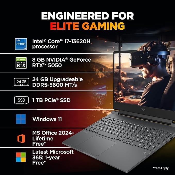 HP Smartchoice Victus, 13th Gen Intel Core i7-13620H, 8GB RTX 5050, 24GB DDR5(Upgradeable) 1TB SSD, 144Hz, FHD, 15.6”/39.6cm, Win11, M365* Office24, Mica Silver, 2.29kg, fa2309TX, RGB Gaming Laptop